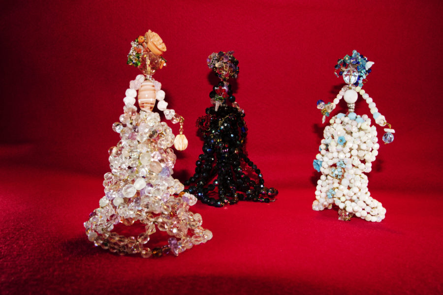 Bamboline in cristalli molati a mano, pasta di vetro, perle, pietre semipreziose.