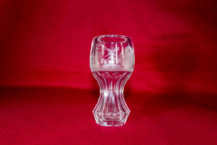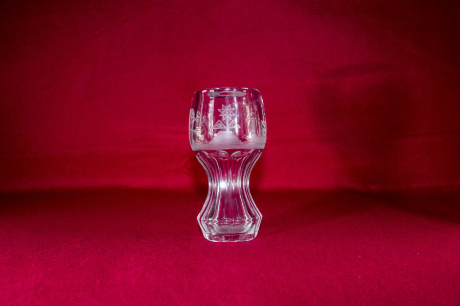 Bicchiere in cristallo, soffiato a mano, molato e inciso a mano con una molteplici simboli massonici.