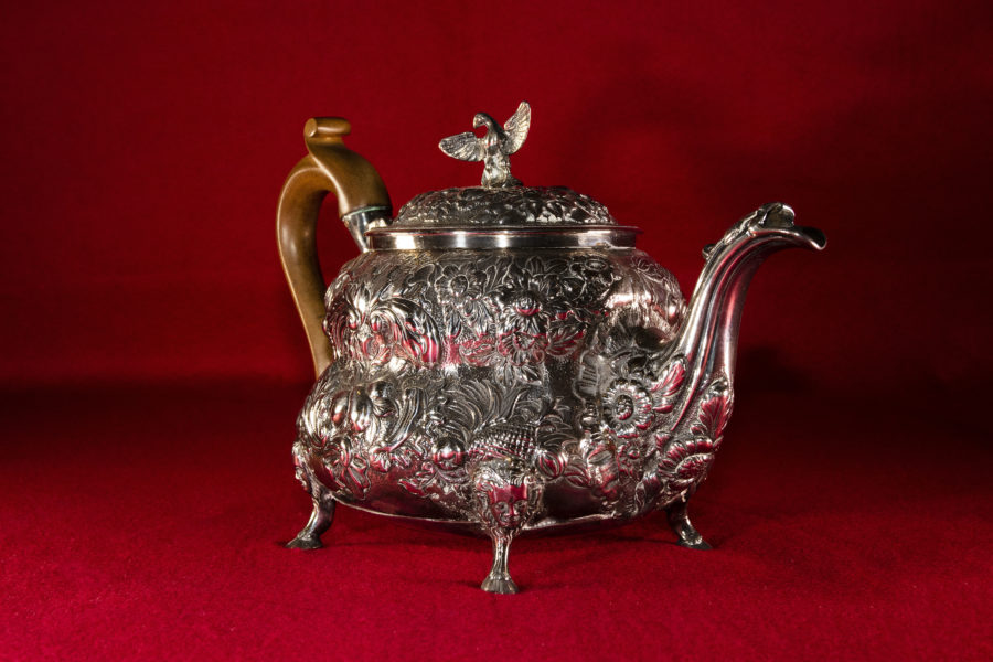 Rara teiera in argento, interamente lavorata a mano, sbalzata e poi rifinita a cesello, decorata con motivi zoomorfi e floreali.