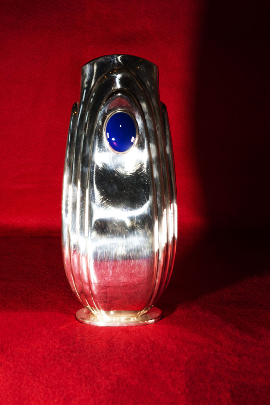 Vaso in argento 925 millesimi, dalle forme sinuose, decorato con due agate blu ovali, taglio cabochon.