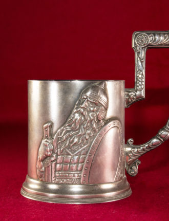 Raro porta bicchiere in argento, di forma cilindrica, decorato ca sbalzo con l'immagine di Yuri Dolgoruky e con il manico con decoro in stile panslavico a rilievo. Condizioni di conservazioni perfette. pezzo pubblicato su "La rivista dell'Antiquariato" anno 1978, collezione Giulia Zoccai. Mosca, Russia, fine XIX secolo. -