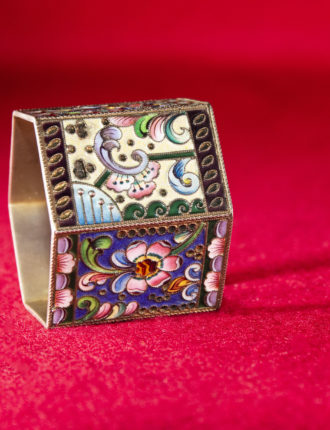 Raro porta tovagliolo in argento di forma esagonale con il decoro che si alterna . Pezzo interamente decorato con smalti cloisonnè sfumati, cotti a fuoco, a raffigurare motivi floreali e motivi in stile panslavico. Condizioni di conservazione perfette. Mosca, Russia, periodo fine XIX secolo. -