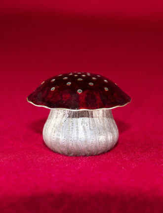 Rara saliera in argento, magistralmente lavorata a mano ì, realisticamente a raffigurare un fungo. Il gambo in argento satinato lavorato e poi inciso, il cappello in argento lucido e smalto guillocher rosso, cotto a fuoco. L'interno dorato a mercurio. Condizioni di conservazione perfette. Marchio del maestro orafo Gratchev, poi marchio di importazione ufficiale in Francia. San Pietroburgo, Russia, periodo fine XIX. -