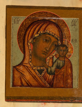 Icona su tavola, dipinta a tempera all' uovo con pigmenti ottenuti da terre e pietre macinate, amalgamate con birra di segale, raffigurante la Gran Madre di Kazan, su un fondo verde chiaro. Condizioni di conservazione ottime, Russia, periodo fine XVIII secolo. -